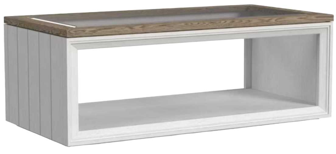 Subtly distressed white finish with a gray parquet stained top.