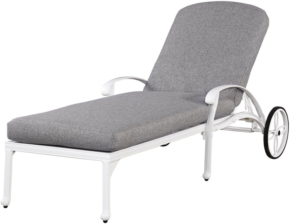 Bring a garden party to your outdoor spaces and bring outdoor living to life. This Capri chaise lounge with cushions is made of cast aluminum with a powder-coated finish for a clean, crisp look. Five preset reclining angles allow you to find the perfect angle for relaxation. Weather-resistant polyester cushions combine cozy comfort with lasting performance, and the neutral color matches any outdoor setting. The large wheels make each lounge easy to move, while nylon glides on the front legs keep it in place while in use. This chaise lounge is built to withstand the elements, from the cushions to the stainless steel hardware.