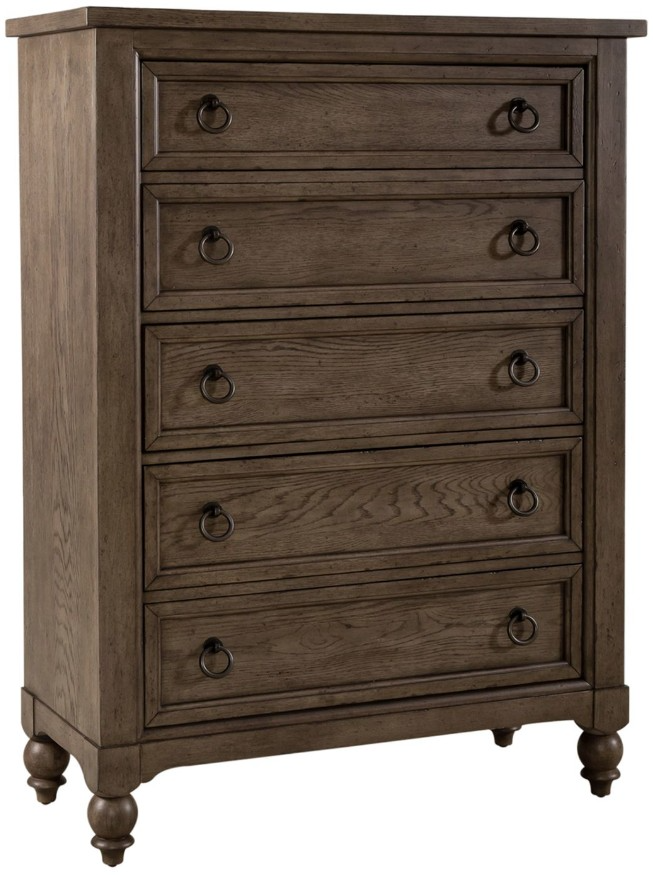 When details matter, choose the Americana Farmhouse 5 drawer chest. Finished in a dusty taupe and accented with antique brass drop ring pull hardware. All 5 drawers feature French and English dovetail construction, wood framing with a beveled edge, and full extension drawer glides.Read More
