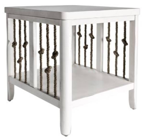 Accent your space with the coastal style Dockside II end table. Crafted of poplar solids and birch veneers, this piece features a white finish with knotted rope end panels and wormhole distressing, softly rounded pilasters flow into tapered feet, appealing planked top with a bottom shelf for additional storage.Read More