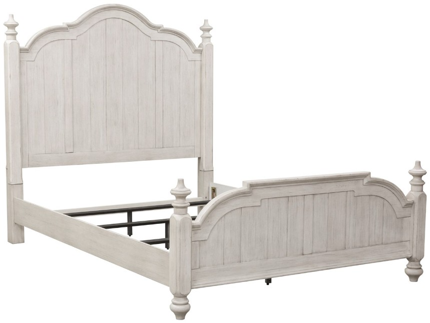 Fall into this cottage style Farmhouse Reimagined poster bed every night. The antique white finish features heavy wire brush distressing, creating a vintage cottage style. High/low veneer panels, shaped posts with decorative turned finials, and the scalloped cap rail add the perfect cottage charm.Read More