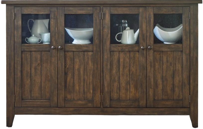 The Midland Falls buffet infuses old world charm with new age sophistication. Crafted of Rubberwood solids and Split Heart White Oak veneers, this piece features a Rustic Brown finish. There are four wood framed planked doors, with a felt lined hidden drawer behind each set of doors.Read More