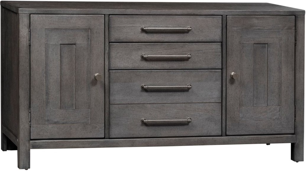 Credenza features geometric high-low door pattern
