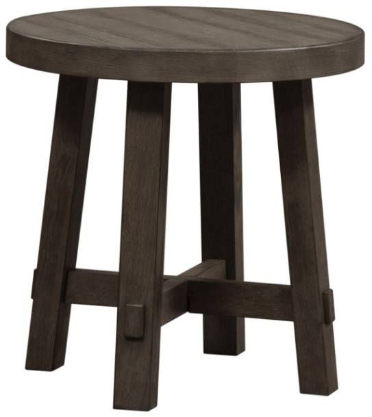 Enhance your space with the Modern Farmhouse splayed leg round end table. Crafted of poplar solids with knotty white oak veneers, this piece features a dusty charcoal finish with heavy distressing, appealing high-low planked top, anchored by a splayed leg design.Read More