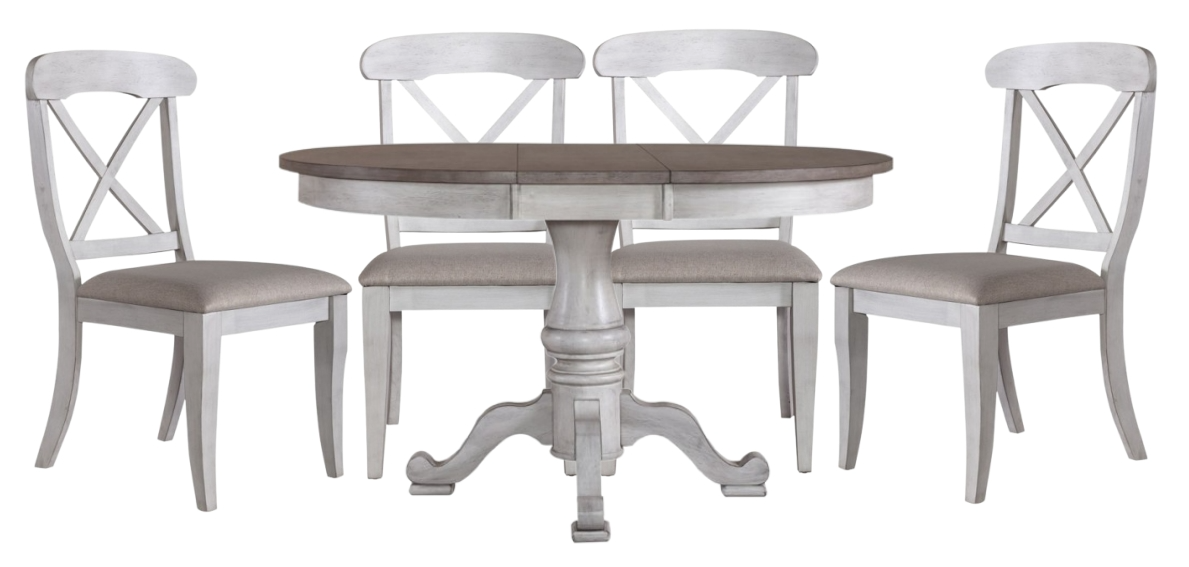 Warm and cozy. Bring beauty indoors with the Ocean Isle five-piece pedestal table set. Crafted of rubberwood solids with New Zealand pine veneers, this set features an antique white and weathered pine finish and consists of four upholstered X back side chairs and a pedestal table.Read More