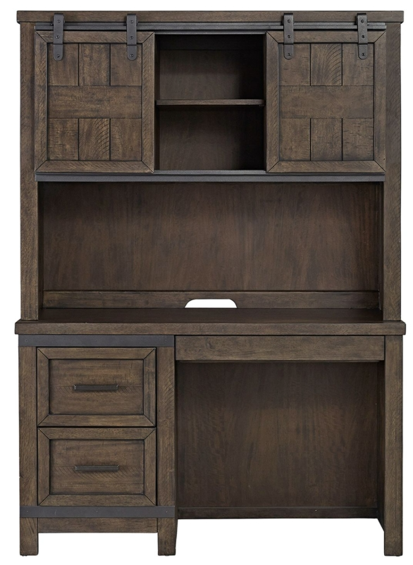 Add a natural feeling to your living space using the Thornwood Hills 2 piece desk set. Crafted with rubberwood solids and mango veneers, the rock beaten gray finish is highlighted by saw cuts and hammered metal strip accents.Read More