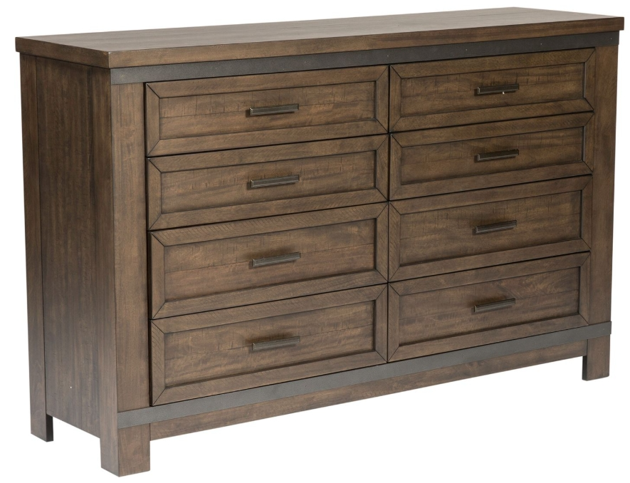 Indulge in a casual, yet contemporary look with this Thornwood Hills 8-drawer dresser. The rock beaten gray finish is accented by saw cut distressing, hammered metal strips across the top and bottom drawers, and hand hammered dark pewter hardware.Read More