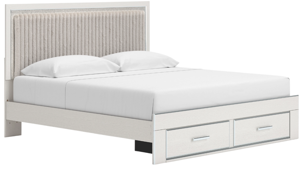 If glitz and glam are your jam, you’re gonna love this king upholstered panel storage bed. Gleaming glitter and dazzling chrome-tone touches are paired with tufted gray faux fur for a stunning pop of pizzazz. And the spacious storage drawers, with large-scale handles and faceted details, don’t disappoint.Read More